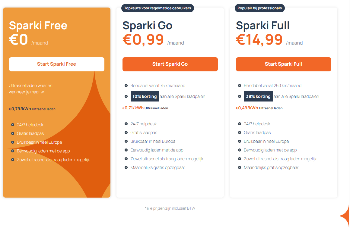 Wil je laden nóg eenvoudiger en voordeliger maken? Vraag dan een laadpas aan. Met de Sparki-laadpas laad je zorgeloos op, in België én heel Europa. Met een abonnement profiteer je van een korting tot wel 38%, krijg je elke maand een overzichtelijke factuur en is je btw-verwerking automatisch geregeld. Bestel je laadpas eenvoudig via de Sparki-app of bekijk hieronder welk abonnement het best bij jou past.